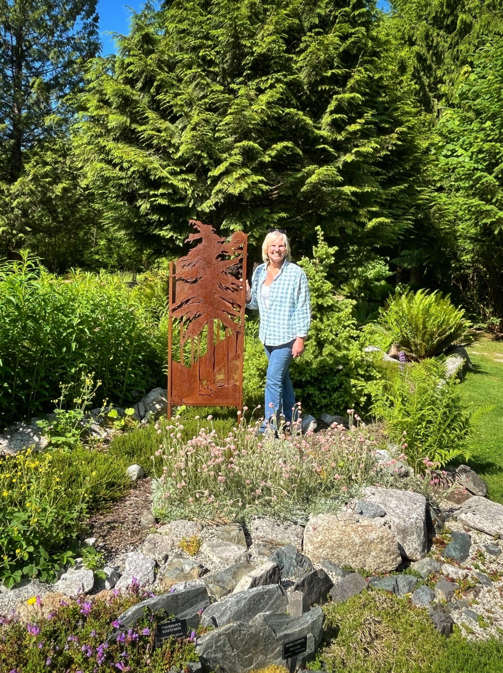 Her piece, ‘Coming Home,’ is an homage to the West Coast. Currently installed in the Native Plant Gardens collection at the Sunshine Coast Botanical Garden, this treated steel screen stands at over 5’ and is a two-dimensional depiction of the Western redcedar (Thuja plicata), a quintessential character of the west coast backdrop, one we might be guilty of taking for granted. Nestled between the plants of the Mountainside Habitat and Rainforest Grove gardens, the vibrant red steel Cedar is honoured, contrasted against the greens of the Salal (Gaultheria shallon), the Pacific Rhododendron (Rhododendron macrophyllum), and the Dull Oregon Grape (Mahonia nervosa).