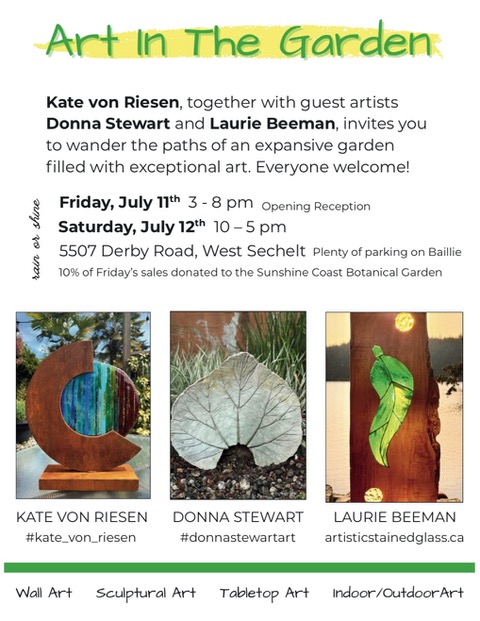ART IN THE GARDEN: On July 11th & 12th, Von Riesen will host an art show in her personal garden and studio in Sechelt. She has invited Laurie Beeman and Donna Stewart to showcase their collections of nature-inspired works and garden sculptures.